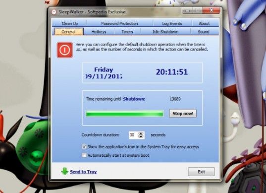 SleepWalker è un programma gratuito che permette di automatizzare il processo di spegnimento del PC in base ad innumerevoli variabili. Utilizzandolo, è possibile spegnere il computer, riavviarlo, programmare la disconnessione dalla sessione di lavoro, spegnere il monitor, eseguire file e lanciare screensaver a determinati orari. Consente anche di ottimizzare i consumi del computer e di arrestare il sistema dopo un determinato periodo di inattività. Da sottolineare, inoltre, la funzione che spegne il PC quando questo si blocca e non risponde più ai comandi. Scarica da qui.
