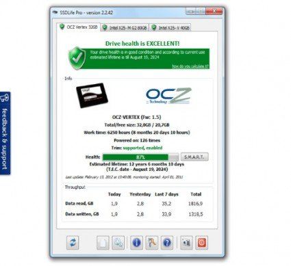 Come si può intuire in maniera abbastanza semplice dal suo nome, SSDlife è un software disegnato per verificare lo stato di salute degli SSD. È disponibile in due versioni, una gratuita che permette di visualizzare tutte le informazioni tecniche sull'SSD in uso e verificare la presenza di errori sul drive, ed una a pagamento che in più offre la funzione SmartCheck per verificare lo stato dell'SSD ad intervalli di tempo regolari e la visualizzazione dei dettagli S.M.A.R.T.. L'edizione Pro è disponibile anche in versione portable. Scarica da qui.