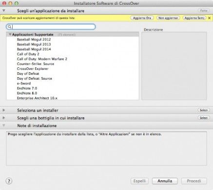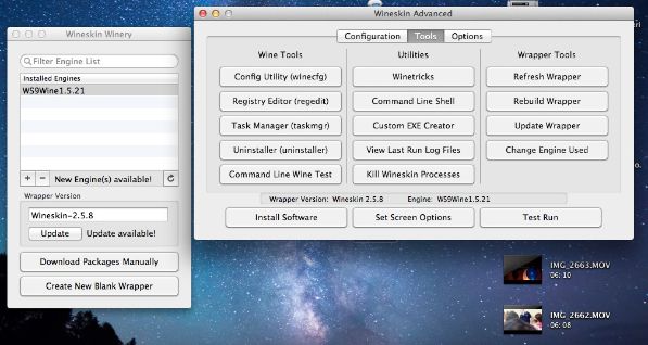 Wineskin è un software gratuito ed open source che permette di usare applicazioni e giochi per Windows su Mac senza dover creare un'intera macchina virtuale con appositi software, come Parallels o VirtualBox. Non è semplicissimo da utilizzare a primo acchito, ma in Rete si trovano moltissimi tutorial su come sfruttarlo al meglio per riprodurre su OS X giochi e applicazioni per Windows. Una volta configurato correttamente, i software per Windows vengono eseguiti e gestiti come applicazioni Mac native. Scarica da qui.