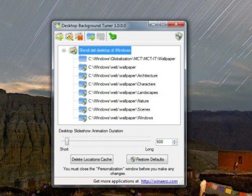 Windows 7 e Windows 8 consentono di impostare molteplici immagini come sfondo del desktop e di applicarle a rotazione in base ad intervalli di tempo prestabiliti, ma consentono di scegliere solo le foto incluse in un'unica cartella. Desktop Background Tuner è una piccola applicazione gratuita che amplia le potenzialità legate ai wallpaper di Windows 7/8 permettendo di creare gruppi di sfondi presi da più cartelle ed applicarli a rotazione sul desktop come se si trovassero nella stessa cartella. È estremamente facile da usare anche se non è stato ancora tradotto in lingua italiana. Scarica da qui.