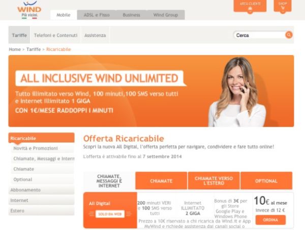 Direi di cominciare dalle offerte ricaricabili, più precisamente dal piano Wind All Digital che è rivolto a tutti coloro che sfruttano molto la connessione dati. A fronte di un canone mensile di 10 euro propone, infatti, 200 minuti di telefonate verso tutti i numeri nazionali, 100 SMS e 2 GB di traffico Internet. Al superamento delle soglie mensili vengono applicate delle tariffe pari a 29 cent/min per le telefonate, 15 cent per gli SMS mentre la navigazione Internet viene abbassata a 32 kbps di velocità gratuitamente. Da sottolineare che il canone mensile sale a 12 euro se non si utilizzano i canali digital di Wind per le ricariche (app MyWind e sito Web dell'operatore) e per l'assistenza tecnica (Facebook e Twitter). Durante il primo mese di sottoscrizione si ha diritto anche a 3 euro di sconto su Windows Store e Google Play. Maggiori info qui.
