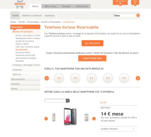 Tutte le offerte ricaricabili di Wind possono essere associate all'acquisto di uno smartphone con rate a partire da 2 euro/mese e un anticipo di 39 euro in media.