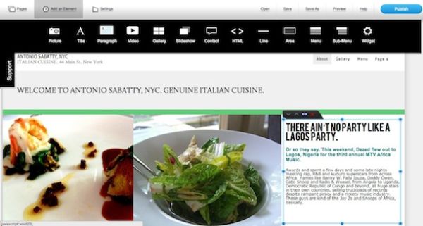 Per aggiungere nuovi elementi al sito, clicca sul pulsante Add an element (che si trova in alto a sinistra) e seleziona uno degli elementi presenti nella barra degli strumenti che compare: Picture per inserire una foto, Title per inserire un titolo, Paragraph per aggiungere un testo, Video per aggiungere un filmato, e così via.