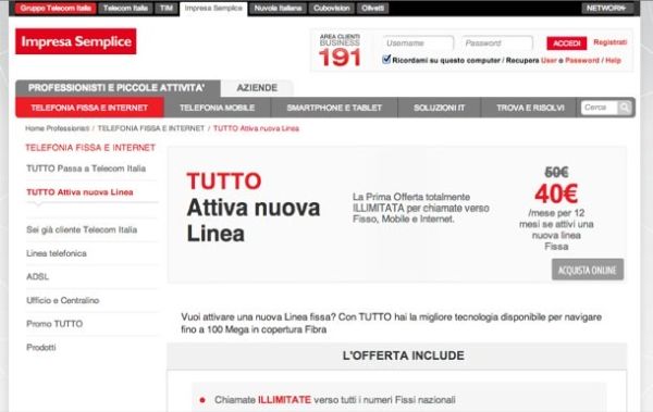 I nuovi abbonati che sono già titolari di una linea possono usufruire dell'offerta TUTTO Passa a Telecom Italia che nel costo di 35 euro/mese (IVA esclusa) comprende una connessione a 100 Mega con 10 Mega in upload, un router Wi-Fi, chiamate illimitate verso fissi e cellulari nazionali, indirizzo IP statico e servizi come Trasferimento e Avviso di chiamata. Insomma, tutto quello che comprende il piano appena analizzato insieme. Anche in questo caso il vincolo contrattuale è di 24 mesi e dopo i primi 12 mesi di sottoscrizione il canone mensile passa a 50 euro + IVA. Maggiori info qui.