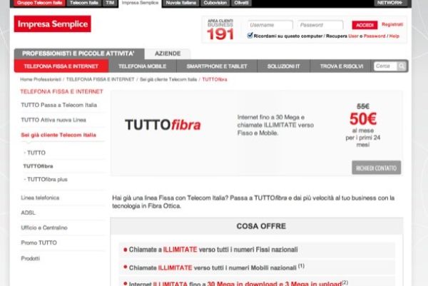 È dedicato ai titolari di linea Telecom Italia anche l'offerta Tutto Fibra che per 50 euro al mese + IVA include una connessione a 30 Mega (con 3 Mega in upload), chiamate illimitate verso fissi e cellulari nazionali, router Wi-Fi, indirizzo IP statico, servizio "Chi è", Trasferimento di chiamata e assistenza con gruppo di operatori dedicato. Trascorsi i primi due anni di sottoscrizione, il canone mensile sale a 55 euro + IVA. Attivazione e installazione gratis. Maggiori info qui.